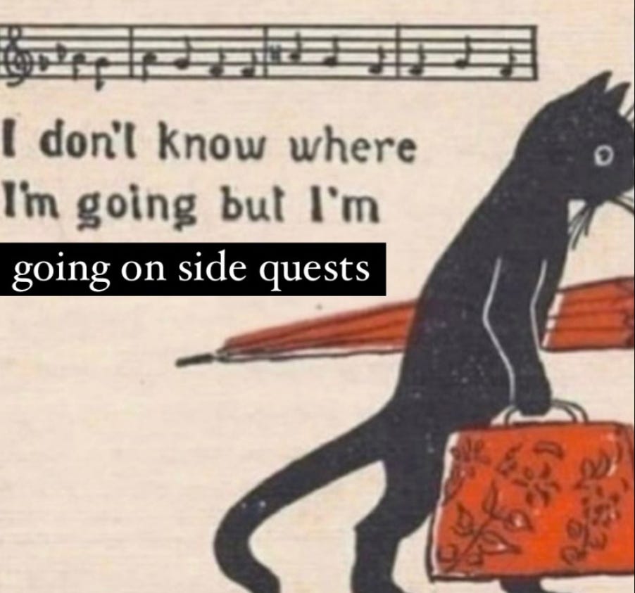 Side Quests are fruitful for the creative and intuitive person because their meandering curiosity diverges from capitalist expectations of productivity and progress. Sometimes, progress can't be measured in a tangible way. Sometimes, progress isn’t even the point.